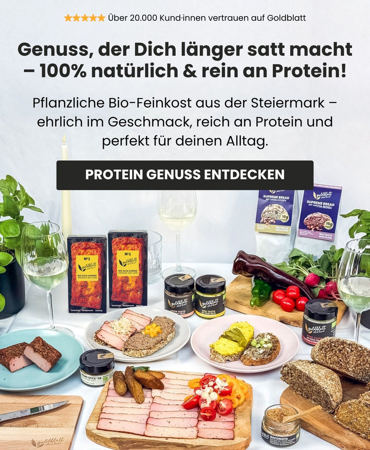 Es ist die Liebe zur Natur, den Tieren und Menschen, warum wir für unsere Goldblätter zu vollwertigen biologischen Zutaten aus der Region greifen. Der Markt ist mit veganem Fleischersatz überschwemmt, der billige Zutaten enthält (Wasser-Pulver-Mischungen) und industriell hergestellt wird sind. Als unser geschätzter Kunde verdienst du eine nahrhafte, qualitativ hochwertige und schmackhafte Ernährung. Deshalb setzen wir auf 100% Bio-Qualität, um uns deutlich von anderen Herstellern abzuheben und dir ein außergewöhnliches Geschmackserlebnis zu bieten. Erst deren natürliche Vielfalt und Intensität ermöglichen Gerüche und Geschmäcker, die Freude bereiten, überraschen. Wir glauben fest daran, dass qualitativ hochwertige Lebensmittel der Schlüssel zu einer gesunden und ausgewogenen Ernährung sind. Bei jeder Produktseite unserer Geniestreiche findest du detaillierte Infos zu den einzelnen Zutaten. Bei uns kannst du Transparenz über die Herkunft und Qualität unserer Produkte erwarten, was uns von anderen Herstellern abhebt.