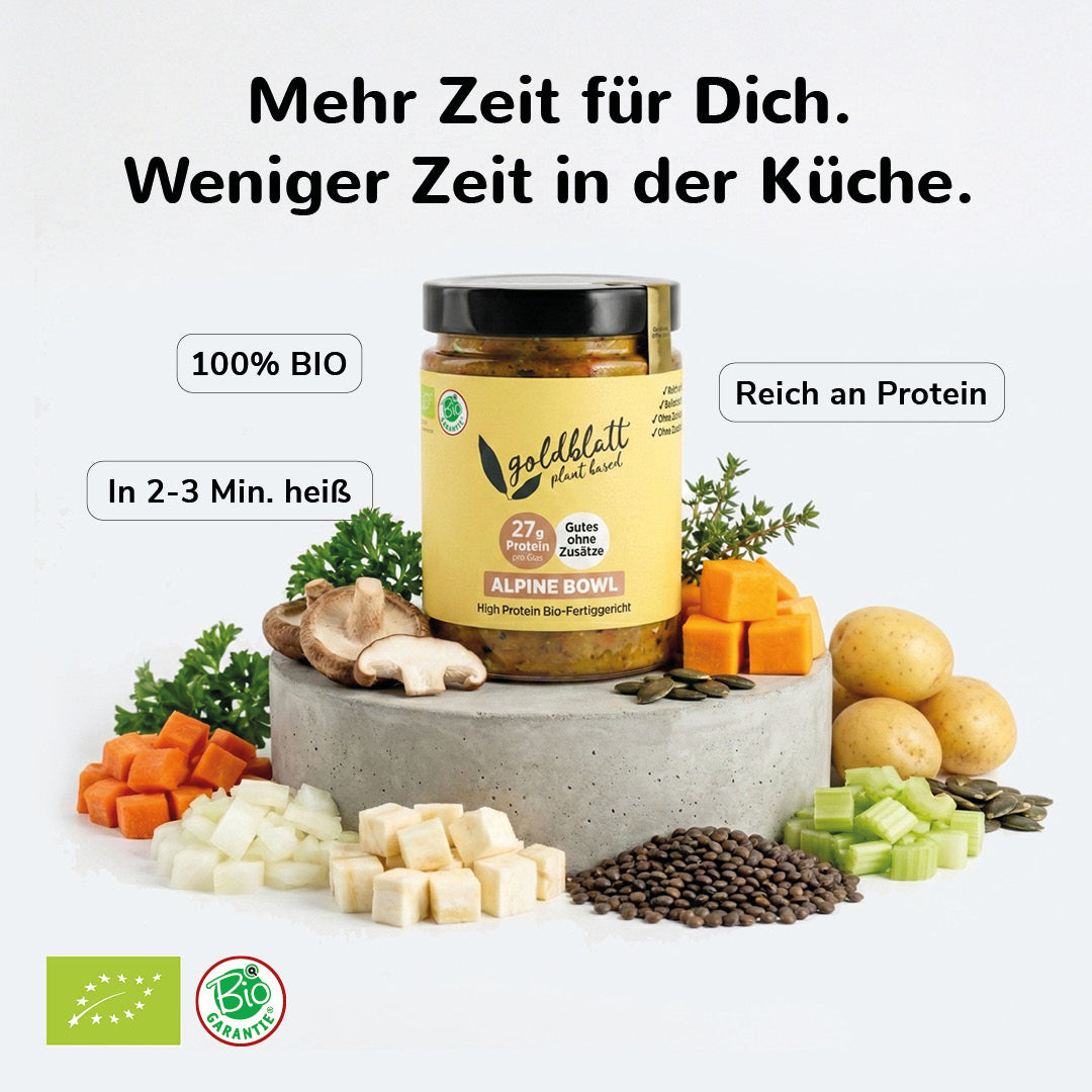 Mit Goldblatt hast du in weniger als 3 Minuten ein vollwertiges Bio-Gericht auf dem Teller. Unsere Rezepte liefern dir reichlich Protein, sättigende Ballaststoffe sowie wertvolle Nährstoffe aus besten pflanzlichen Bio-Zutaten. Praktisch im Glas, mindestens 1 Jahr haltbar – perfekt für deinen Alltag, ob daheim oder unterwegs.