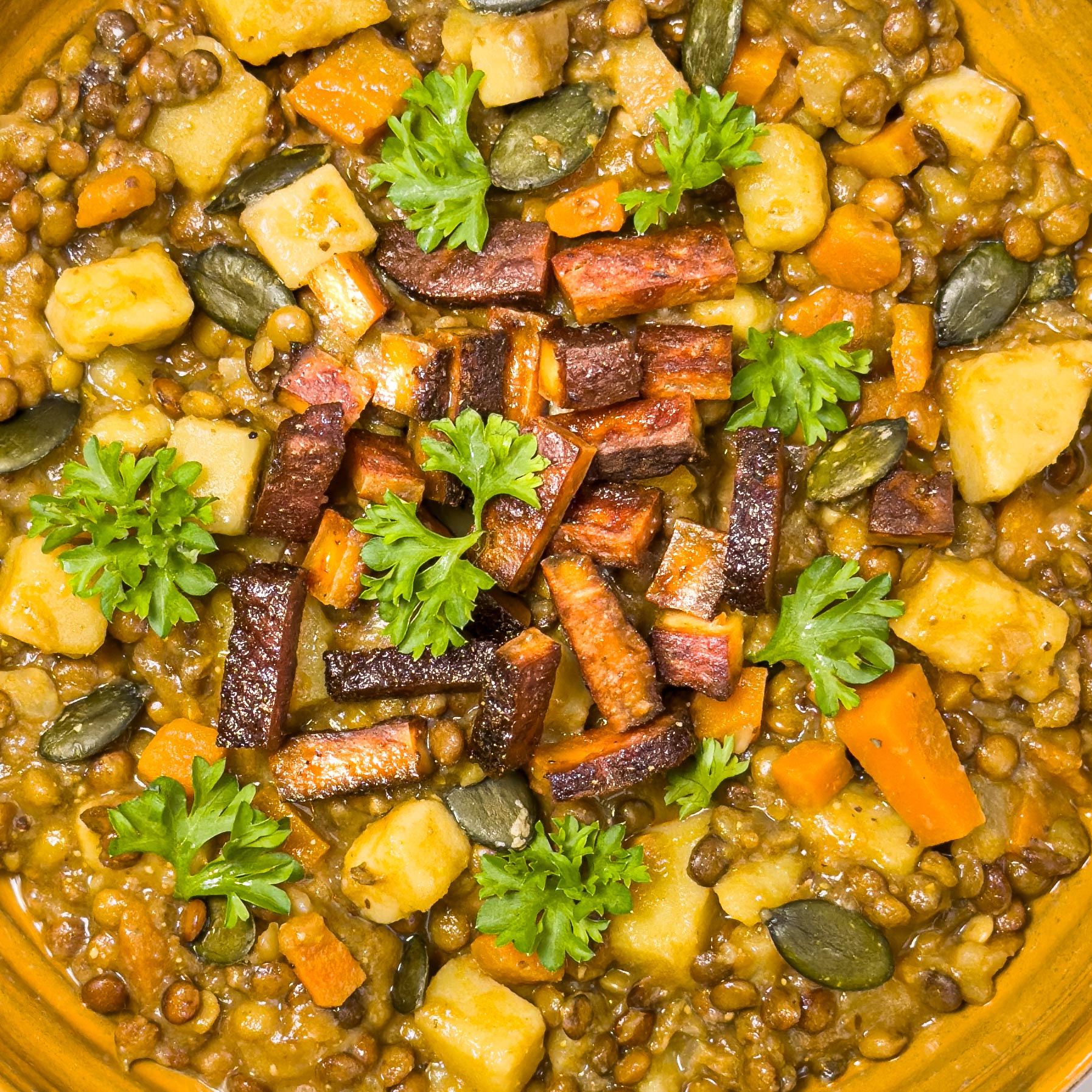 Gemüsebrühe° (Wasser, Meersalz, Karotten*, Zwiebel°, Pastinake°, Shiitake°, Kürbis°, Sonnenblumenöl°, Gewürze°, Kräuter°), Kartoffeln°, Berglinsen° 14 %, Karotten°, SELLERIE°, Zwiebel°, Kürbiskerne° 3,7 %, Tomatenmark°, Leinmehl°, Apfelessig°, Zitronensaft°, Gewürze°, Kräuter°, SENFpulver°, Chili°, Salz.
