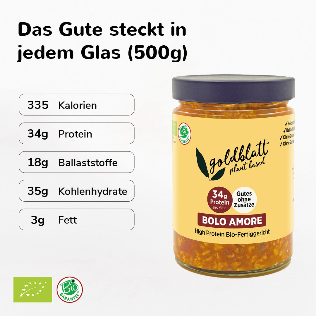 Unsere Goldblatt High Protein Bio-Fertiggerichte enthalten 500 g pro Glas und sind damit größer als viele herkömmliche Fertiggerichte. Ein Glas entspricht in Kombination mit einer Beilage wie Reis, Nudeln oder Kartoffeln zwei vollwertigen Portionen.