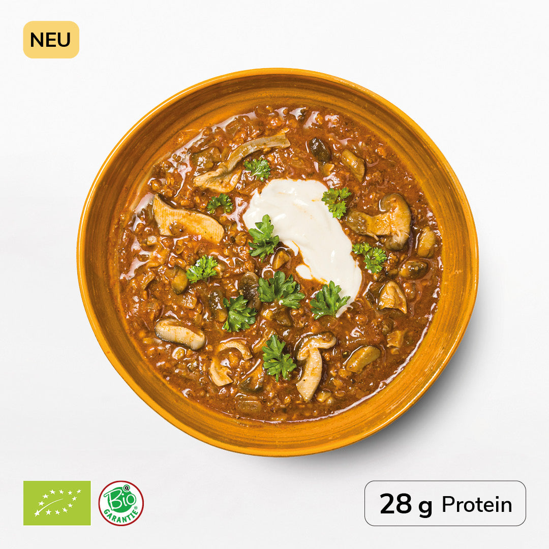 Ja – unsere Bio-Fertiggerichte sind reich an Protein und Ballaststoffen. Das sorgt für ein langanhaltendes Sättigungsgefühl, obwohl die Kalorien im Vergleich zu einer klassischen Mahlzeit moderat bleiben. So kannst du dich ausgewogen ernähren und dein Ziel leichter erreichen – ohne Hungergefühl und ohne Verzicht auf Genuss.