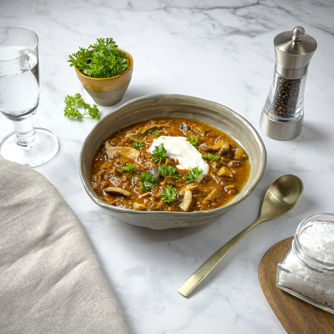 Geschmorte Delikatesse: Unser Edelpilz-Gulasch bringt edle Pilze mit würzigen Soja-Chunks, Paprikagewürz und gerösteten Zwiebeln zusammen – ein vollmundiges Wohlfühlgericht.