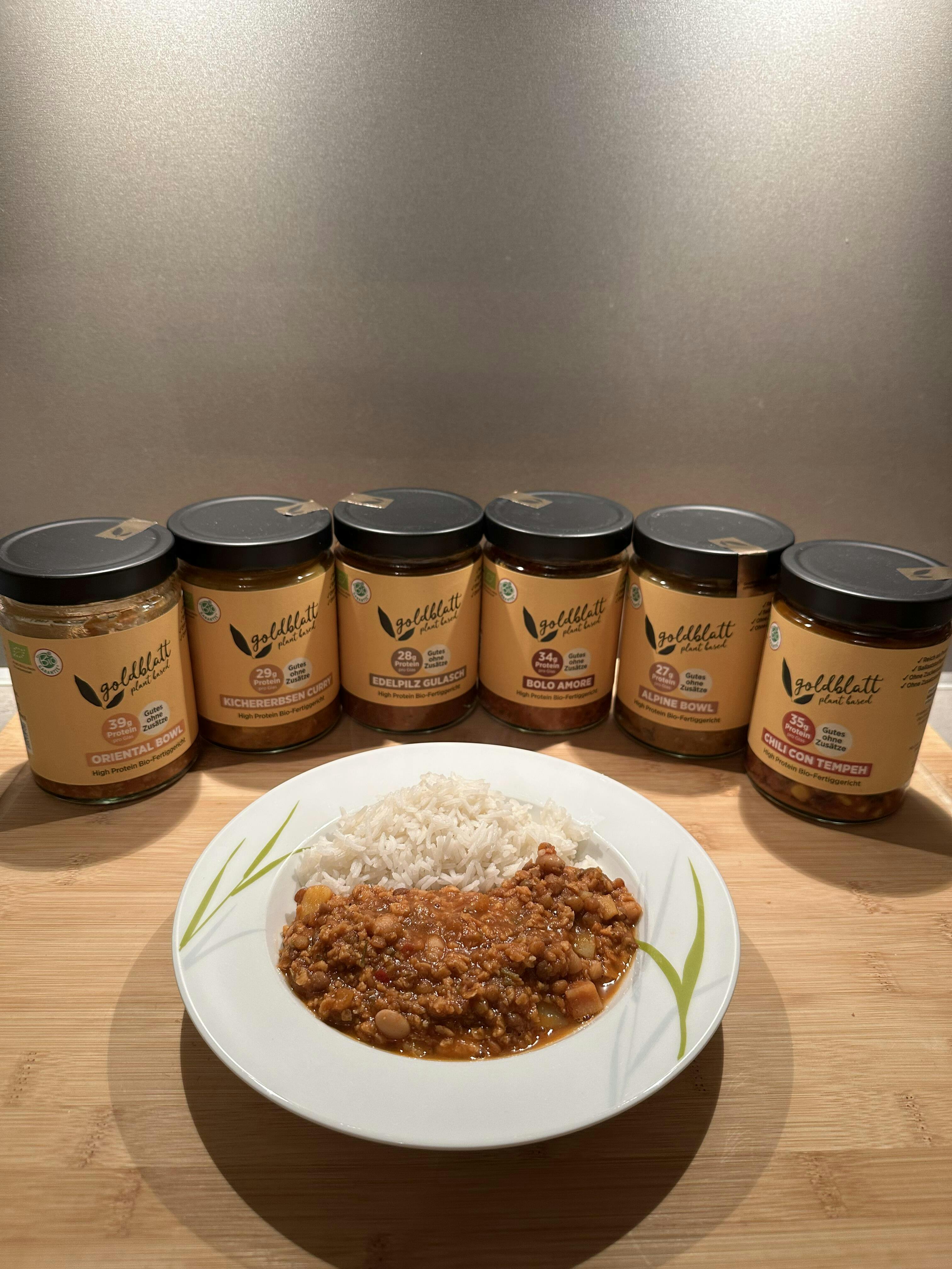 Unsere Goldblatt High Protein Bio-Fertiggerichte enthalten 500 g pro Glas und sind damit größer als viele herkömmliche Fertiggerichte. Ein Glas entspricht in Kombination mit einer Beilage wie Reis, Nudeln oder Kartoffeln zwei vollwertigen Portionen.