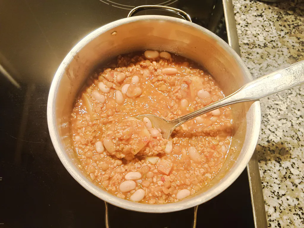 Gemüsebrühe° (Wasser, Karotten°, Rote Beete°, Meersalz, Orangenschalen°, Zwiebel°, Knoblauch°, Gewürze°, Kräuter°), Tomaten° passiert, SOJAhack° (SOJAmehl) 11 %, Berglinsen° 8 %, Weiße Bohnen° 7 %, Kartoffeln°, Tomatenmark°, Kürbis°, Zwiebel°, SELLERIE°, Leinmehl°, Rapsöl°, Zitronensaft°, Apfelessig°, Gewürze°, Kräuter°, Chili°, Salz.