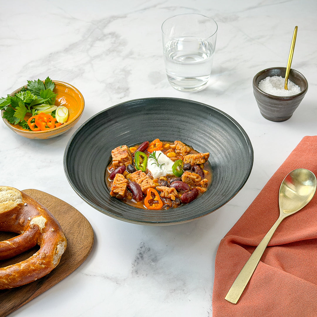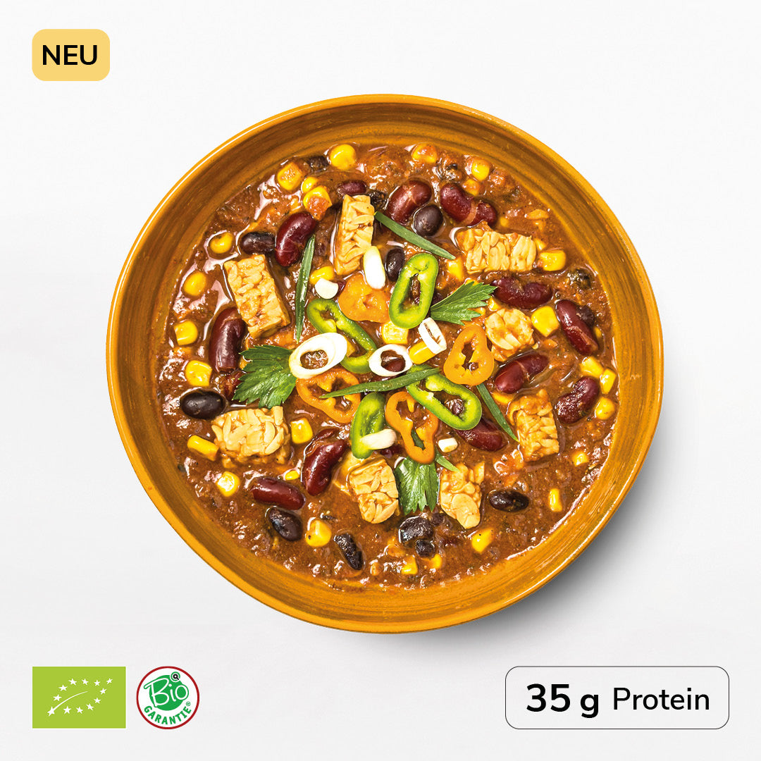 Wasser, Tomaten° passiert, Zuckermais°, Rote Bohnen°, Tempeh° (SOJAbohnen° 53 %, Wasser, Rhizopus Starterkulturen) 11 %, Schwarze Bohnen°, Zwiebel°, Leinsamenmehl°, Tomatenmark°, Apfelessig°, Gewürze°, Kakaopulver°, Zitronensaft°, Chili°, Knoblauch°, Salz. °aus kontrolliert biologischer Landwirtschaft.