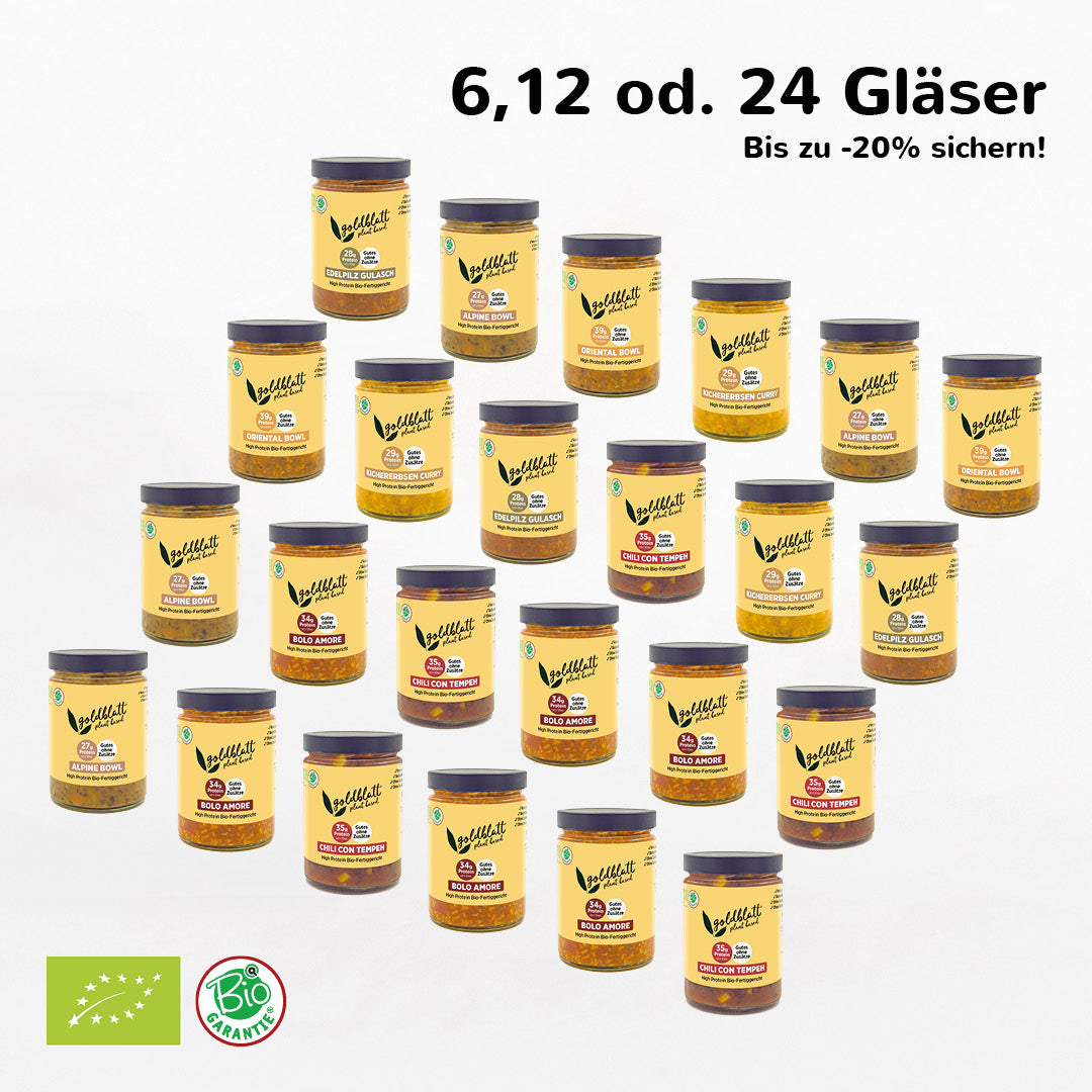 Unsere Goldblatt High Protein Bio-Fertiggerichte enthalten 500 g pro Glas und sind damit größer als viele herkömmliche Fertiggerichte. Ein Glas entspricht in Kombination mit einer Beilage wie Reis, Nudeln oder Kartoffeln zwei vollwertigen Portionen.