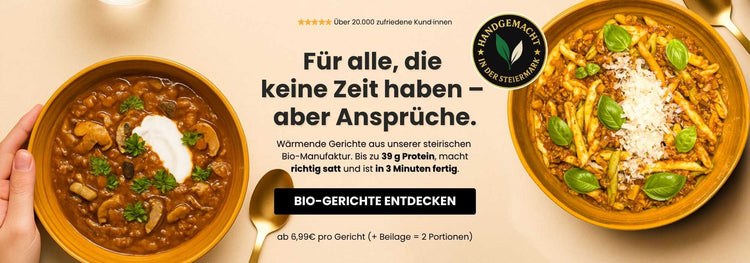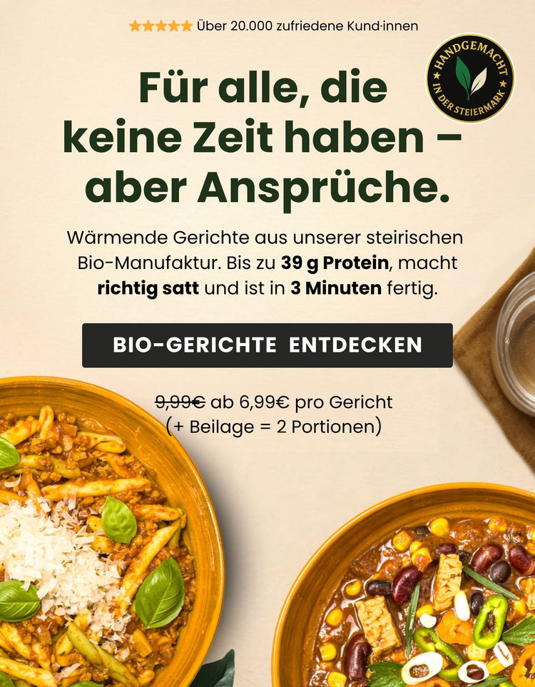 Was macht uns anders? Wir greifen für unsere Produkte auf 100% biologische Zutaten, wenn möglich aus Österreich. Keine Wasser-Pulver-Mischungen, keine Fabrikware – nur handgemachte Bio-Gerichte aus unserer Manufaktur in Bad Waltersdorf.Das bekommst du: